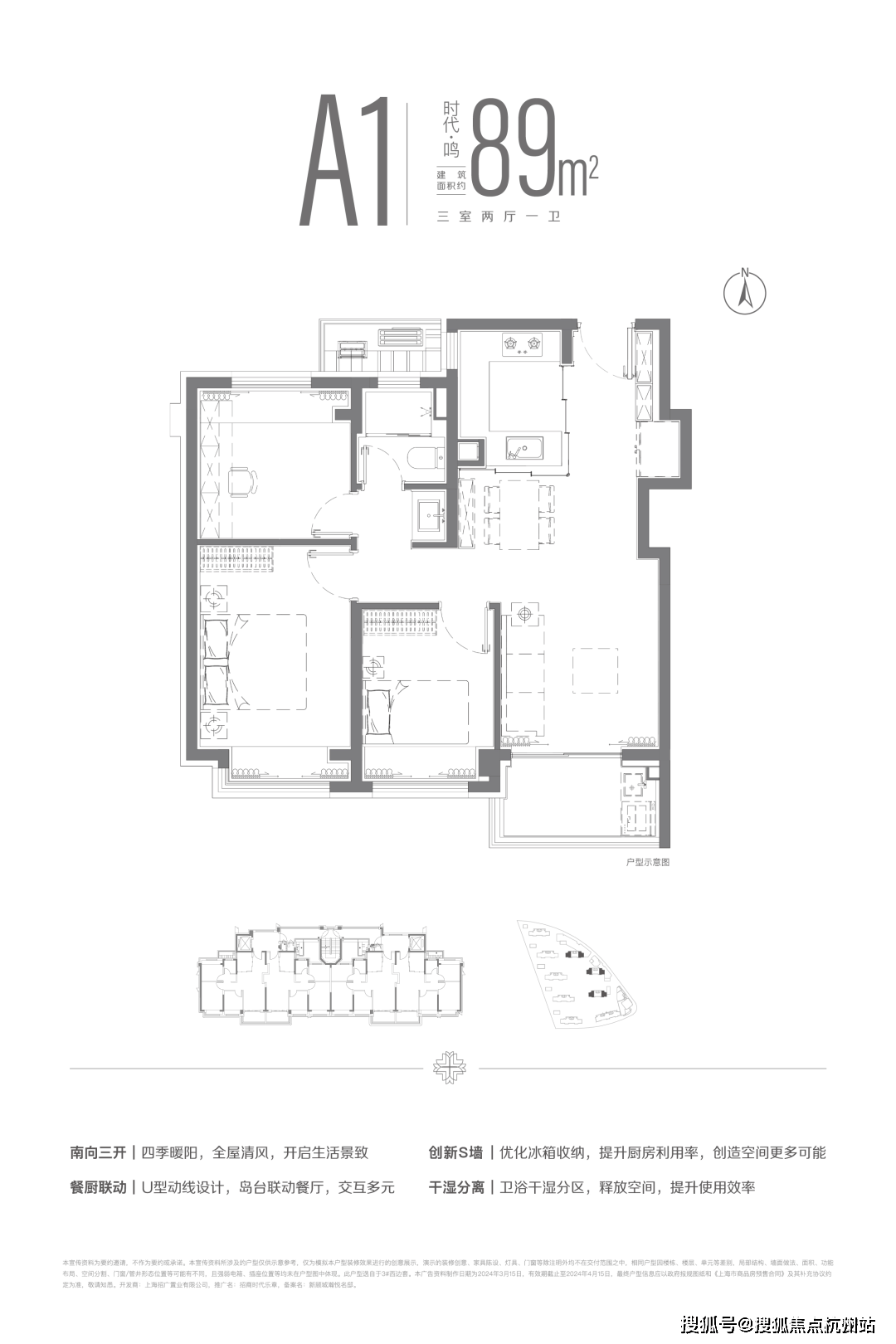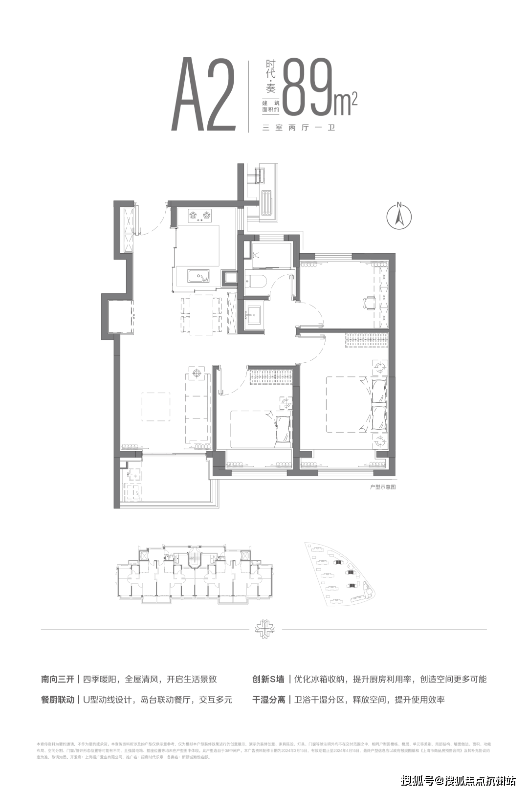 建面约89m²三房两厅一卫户型。